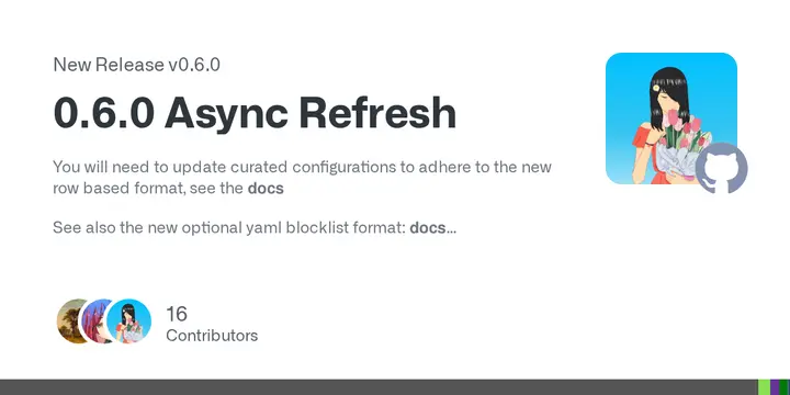 You will need to update curated configurations to adhere to the new row based format, see the docs See also the new optional yaml blocklist format: docs Bazaar now caches online state and thus allo...