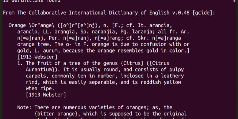 Here you will find list of dictionary apps that are available in Linux. The apps will help you look up definitions and phrases and if you are connected to the internet you can also try Google search to get word definitions.