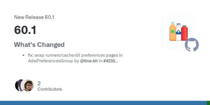 What's Changed fix: wrap runners/cache/dll preferences pages in AdwPreferencesGroup by @lina-bh in #4235 60.1 by @mirkobrombin in #4237