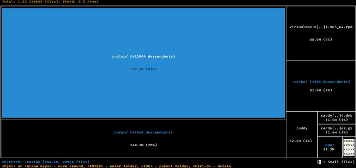 When the scanning is complete, you can navigate through subdirectories, getting a visual treemap representation of what’s consuming your disk space. diskonaut allows you to delete files and directories and as a result, tracks the amount of space you have freed up in the process. It also supports keyboard shortcuts to ease navigation.