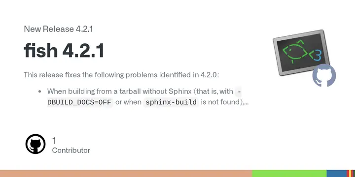 So there was a recent update for Fish shell, not a huge leap forward, but important because it fixes some problems people were running into. A common setup involved installing from a tarball, skipping Sphinx documentation builds by using -DBUILD_DOCS=OFF. This worked fine most of the time, but occasionally users would encounter a situation where the sphinx-build executable just wasn't there.