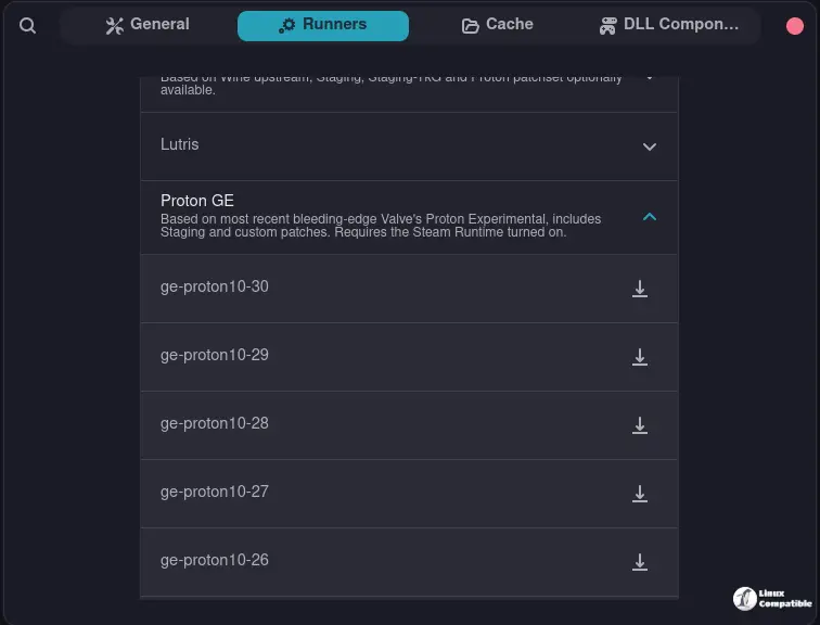 GE‑Proton can also be used with tools like Bottles, which run Windows games inside a Flatpak sandbox. To upgrade to the latest GE‑Proton release, go to Settings => Runners => Proton GE.