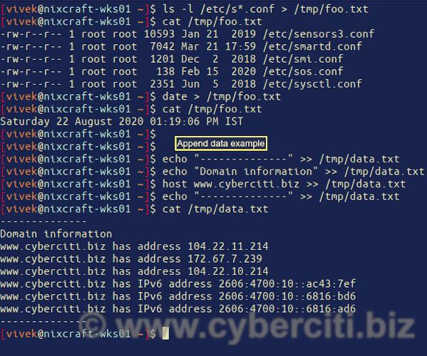 Learn bash and POSIX shell file input and output redirection to write the output into the file under Linux, macOS, or Unix-like systems.