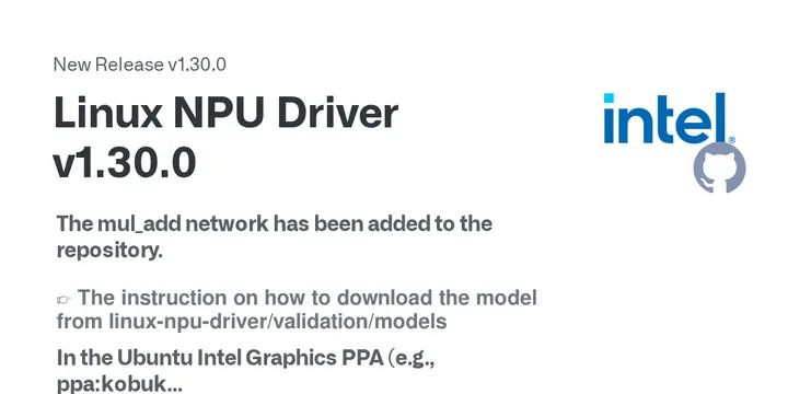 wget https://github.com/intel/linux-npu-driver/releases/download/v1.30.0/\ linux-npu-driver-v1.30.0.20260311-22963593310-ubuntu2404.tar.gz tar -xf linux-npu-driver-v1.30.0.20260311-22963593310-ubuntu2404.tar.gz