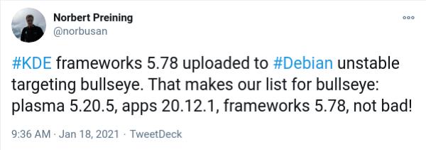 Norbert Preining published a tweet that KDE Plasma 5.20.5, Apps 20.12.1, and Frameworks 5.78 just made it into the upcoming Debian 11 Bullseye release