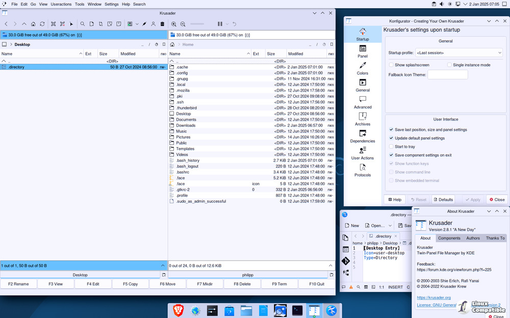 Krusader 2.9.0 "Sixth Life", a powerful twin-panel file manager for KDE Plasma and other desktops, has been released. It includes sophisticated archive handling, mounted filesystem support, file transfers via (S)FTP, an advanced search module, copy/move queues, an internal reader and editor, directory synchronization, file content comparisons, and powerful batch renaming.