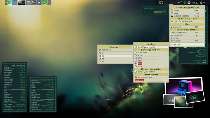 Mabox Linux 25.04 Istredd has been released, which includes enhancements to the panel and the addition of a status indicator featuring a dynamic menu. The panel icon has been enhanced to include a thumbnail and new functionalities, enabling users to customize the wallpaper and style of desktop elements. The quick configuration menu for the panel now features a floating panel switch, along with the addition of a status indicator that includes disk usage reporting, a dynamic pipemenu for navigating mounted drives, and a directory size monitor. The status indicator features disk usage reporting, a dynamic pipemenu for navigating mounted drives, and a directory size monitor for logs, pacman cache, trash can, and downloads. The menu includes details regarding the current kernel version, installed packages, and the date of installation.