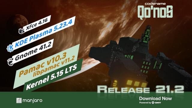 The final version of Manjaro 21.2.0 Qonos with Kernel 5.15 LTS, GNOME 41.2, KDE Plasma 5.23.4, and Xfce 4.16 has been released.