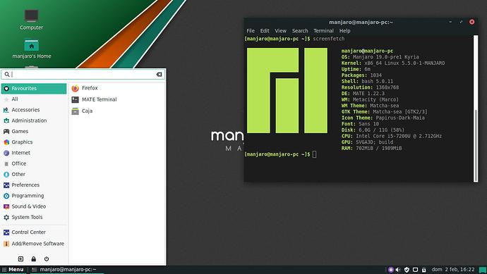 I m proud to announce the first preview of the upcoming Manjaro Mate 19.0 Kyria release. This Iso ship the latest kernel 5.5 , zstd compression ( more big in size but more fast to install ) and this should resolve the issue made with the recent changes into libalpm. In this iso are not present mate-tweak since not work fine for us ( but also for Solus since i have tested also there and i see the same error ) and since Ubuntu-Mate developers seem not have time to look at my MR and issue.