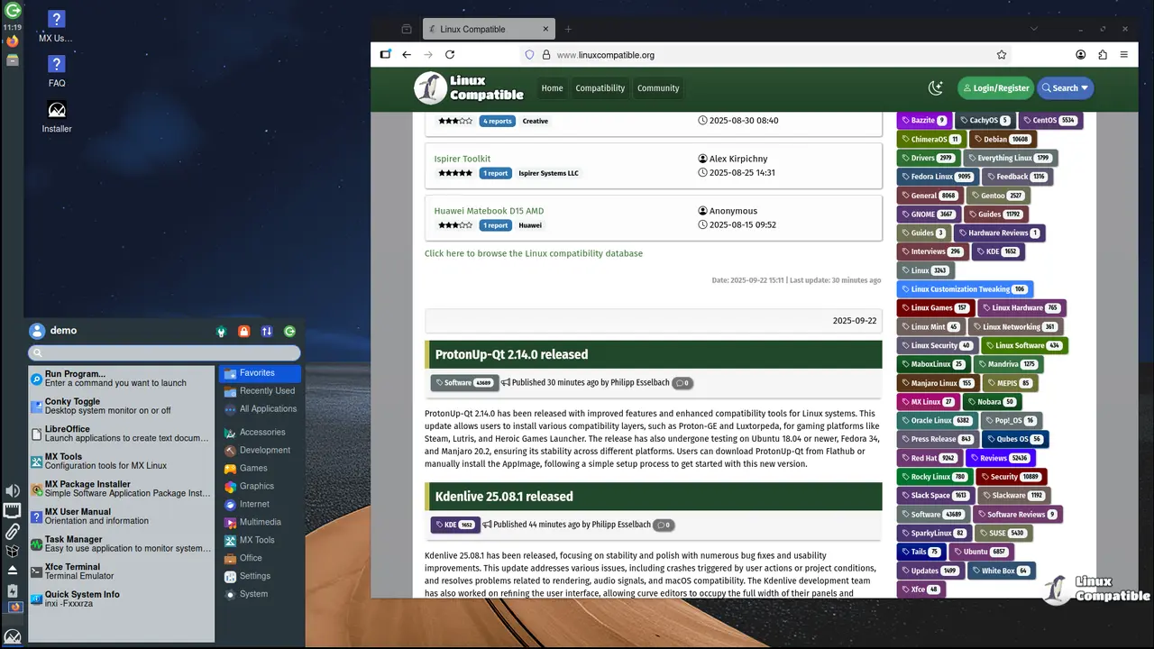 MX Linux has released the MX-25 "Infinity" beta 1, built from Debian 13, which combines elegant desktops with high stability and performance. This release includes various updates, such as Qt6 migration for MX Tools, new deb822 format support, and improvements to the installer, including UEFI Secure Boot support. Users can test the beta 1 and provide feedback on areas like the installer and MX tools, particularly for popular app entries in MX Package Installer.
