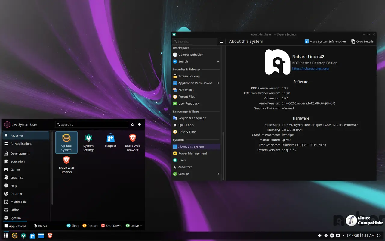 The official launch of Nobara Linux 42 features Brave as the default browser. The modification follows comprehensive testing, during which multiple browsers, including Firefox and those based on it, exhibited GPU crashes when scrolling through live videos with VRR enabled. Brave emerged as the sole browser that maintained stability amidst these challenges and did not necessitate any external or system packages for enabling codecs for video playback. The Nobara Package Manager has been removed from the desktop and favorites; however, experienced users can still locate it in the menu. Plasma-discover and gnome-software have been substituted with flatpost, a comprehensive solution for flatpaks. Nobara has officially transitioned to a rolling release model, allowing users to receive all updates for Nobara 42 packages through the system updater. Mesa has received updates that include further enhancements for Wine Wayland and DOOM: The Dark Ages.