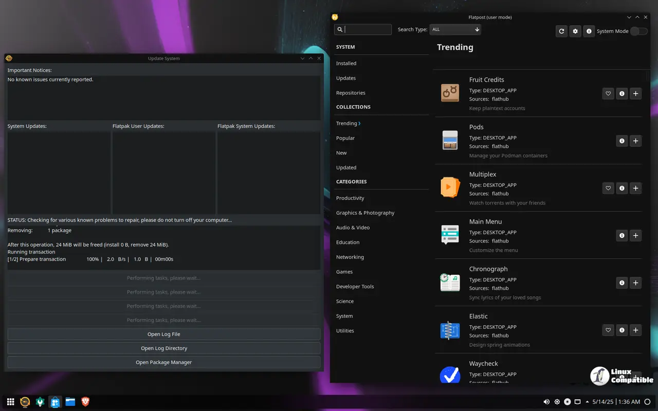 - plasma-discover and gnome-software have both now been replaced with flatpost. Flatpost is a new in-house developed one-stop shop for flatpaks. It is able to handle installation, removal, upgrading, and permissions of flatpaks as well as flatpak repository management. You should find it provides all of the same permission toggles as flatseal. It is a simple application built on python and gtk, and is meant to be a desktop environment agnostic solution (meaning it should run in any DE). We did this because while we only support Gnome and KDE, we understand users still want to install their own environments and will do so regardless of whether or not it’s supported. If they are going to do that, again we prefer users to install flatpaks where possible for their software needs, and not all environments have a flatpak shop. For example if I’m using hyprland or labwc, now I have a shop I can use with them: https://github.com/GloriousEggroll/flatpost. Users can still manually install plasma-discover or gnome-software if they prefer.