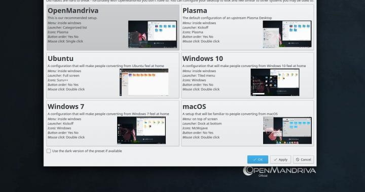 Desktop Presets (om-feeling-like) to customize the appearance of your OpenMandriva Plasma desktop to look and feel similar to other systems you may be used to;