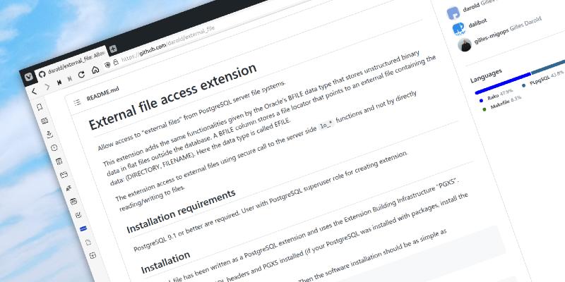 external_file is an open project under the PostgreSQL license created by Dominique Legendre ( BRGM) and maintained by Gilles Darold ( MigOps). Any contribution to build a better tool is welcome. You can send your ideas, features requests or patches using the GitHub tools.