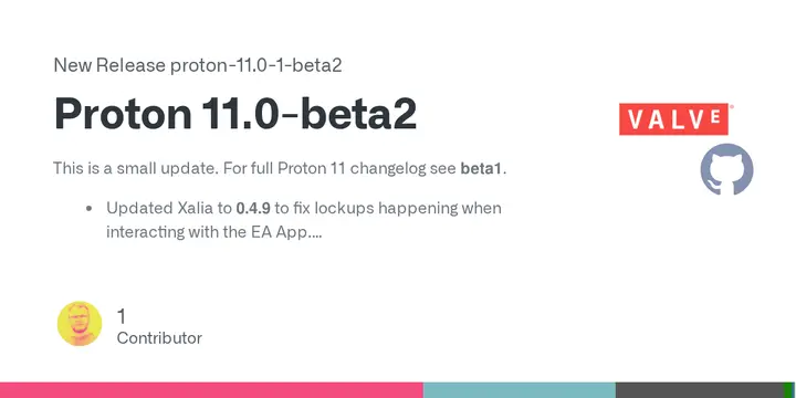 This is a small update. For full Proton 11 changelog see beta1. Updated Xalia to 0.4.9 to fix lockups happening when interacting with the EA App.