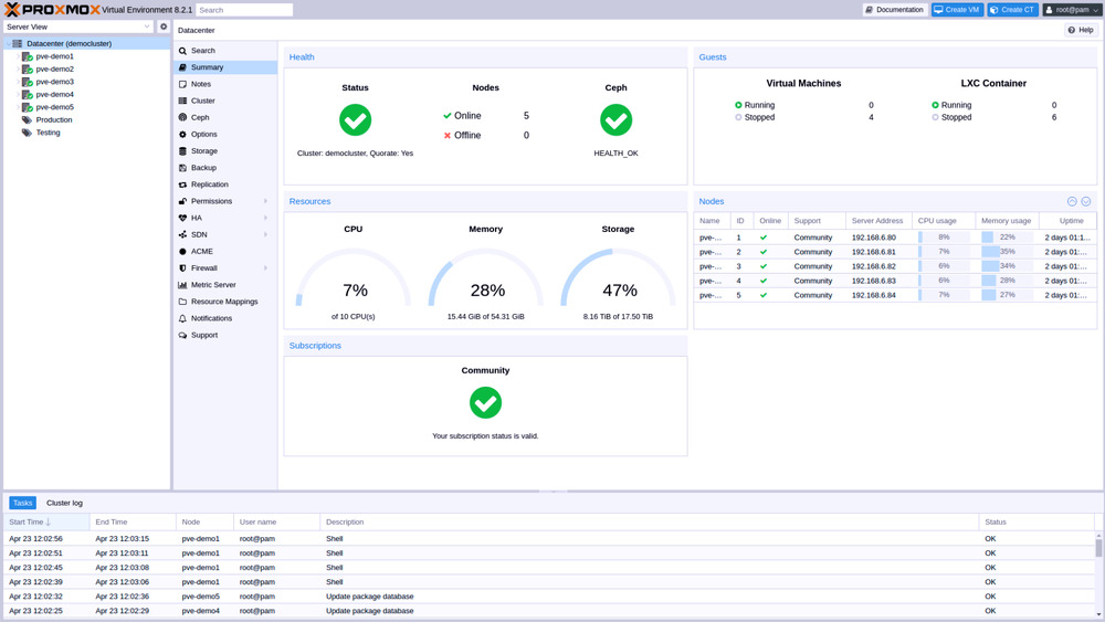- Latest versions of open-source technologies: Proxmox VE 8.4 is based on Debian 12.10 (“Bookworm”), but uses the Linux kernel 6.8.12 as stable default and the newer kernel 6.14 as opt-in. This version of Proxmox VE includes updates to the latest versions of leading open-source technologies for virtual environments like QEMU 9.2.0, LXC 6.0.0, ZFS 2.2.7 with compatibility patches for kernel 6.14, and Ceph Squid 19.2.1 as stable option.