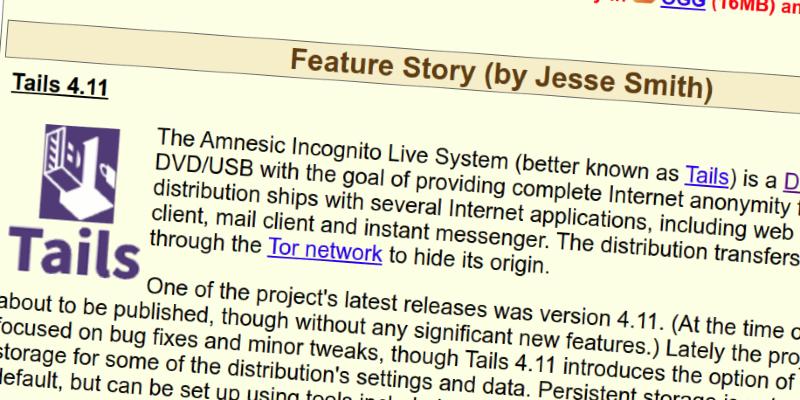 DistroWatch published a review on Tails 4.11, a Debian-based live DVD/USB with the goal of providing complete Internet anonymity for the user.