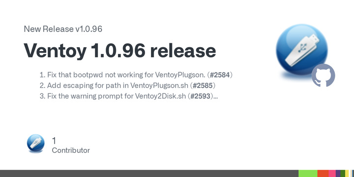 A new version of Ventoy has been released. Ventoy is an open source tool to create bootable USB drive for ISO/WIM/IMG/VHD(x)/EFI files.