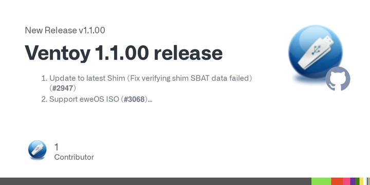 Ventoy 1.1.00 has been released, which includes Shim updates, eweOS ISO support, and bug fixes.