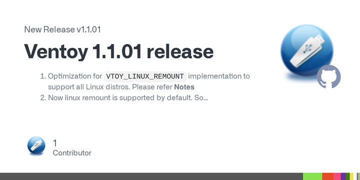 Ventoy 1.1.01 has been released and optimizes the VTOY_LINUX_REMOUNT implementation for all Linux distributions while deprecating the VTOY_LINUX_REMOUNT option.