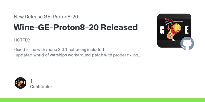 -updated world of warships workaround patch with proper fix, no longer requires environment variable (thanks OOOOOF123)Release Wine-GE-Proton8-20 Released · GloriousEggroll/wine-ge-custom