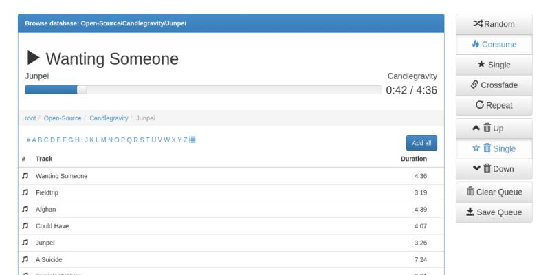 ympd is a lightweight MPD (Music Player Daemon) web client that runs without a dedicated webserver or interpreters like PHP, NodeJS or Ruby.