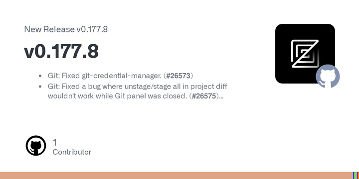 Zed 0.177.8 has been released, featuring multiple updates, such as resolutions for git-credential-manager, improvements to unstage/stage functionalities, adjustments for commit messages to wrap at 72 characters, and modifications to the renaming of editor::.Change ToggleGitBlame to git::Blame, while resolving concerns related to version control colors, modal layer dismissal, automatic indentation for multi-line pasted content, and soft_wrap configurations.
