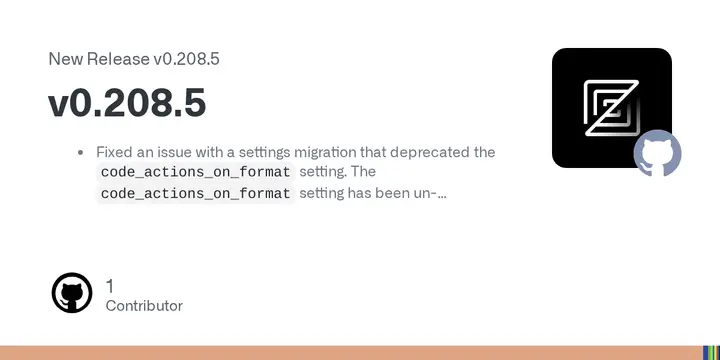 The new version has some breaking changes. It no longer lets you have format steps in both the "format_on_save" and "formatter" settings for languages. Instead, you have to put all of your format steps under the "formatter" key. Zed Editor will also not use a node from your $PATH if it is older than 22.x; instead, it will use the node that comes with it.